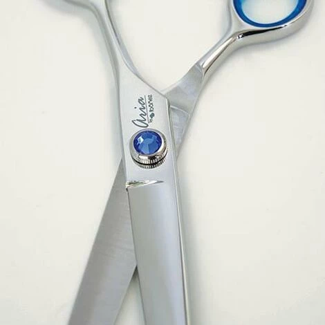 – Glänzender Edelstahl und Einstellschraube verziert mit einem edlen, blau geschnitzten Stein. Sie ermöglicht die Anpassung der Schere an jede Haarart und den persönlichen