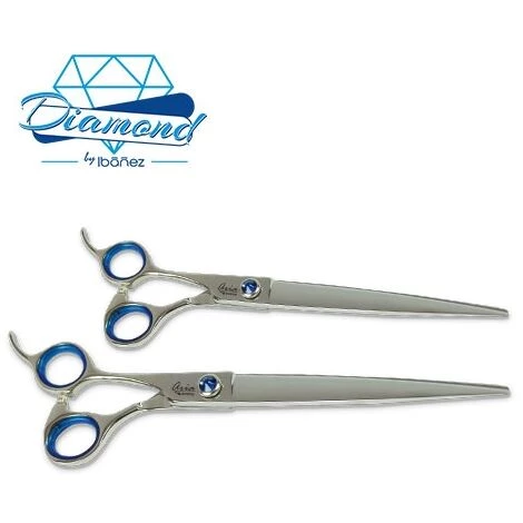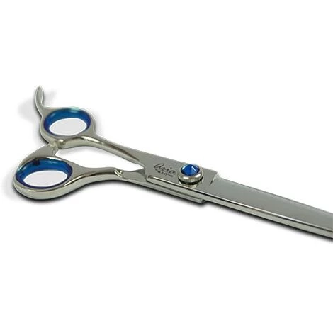 – Glänzender Edelstahl und Einstellschraube verziert mit einem edlen, blau geschnitzten Stein. Sie ermöglicht die Anpassung der Schere an jede Haarart und den persönlichen