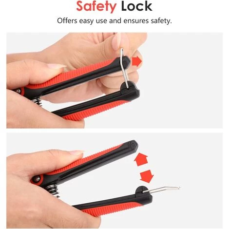 Eingebaute Feder: Eine Feder zwischen den Griffen sorgt für konstanten und gleichmäßigen Druck für einen stabilen Griff Komfortabler Griff: Der Griff ist auf Komfort ausgelegt und hat eine weiche PP-Beschichtung für Stabilität (passt auch mit kleinen Händen als mit großen Händen) < br>Sicherheitsverriegelung: schützt die Klinge bei Transport und Lagerung.