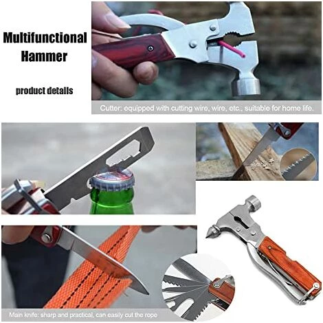 【Breite Anwendung】Ideal für Camping , Angeln, Wandern, Heimwerkerarbeiten und ein toller Multitool-Hammer! Kann schneiden, heben, Schrauben drehen, Hydranten öffnen, Holz sägen, stark genug, um Glasfassaden zu zerbrechen, Seilvorhänge bei gefährlichen Fluchten zu schneiden usw. Edelstahl mit Holzgriff, der Taschenhammer ist rostfrei und korrosionsbeständig, langlebig und angenehm zu greifen Extragebühr. Mehrere Werkzeuge in einem, um Platz in Ihrer Werkzeugtasche zu sparen, tragbar und praktisch, multifunktionales, unverzichtbares Werkzeug für zu Hause und im Freien