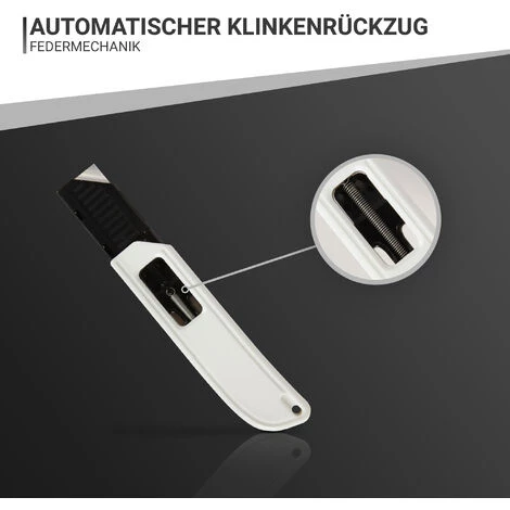 Um das Gefahrenrisiko bei der Nutzung des Kartonschneiders zu minimieren wird die Klinge durch die eingebaute Federmechanik nach dem loslassen des Mechanismus von alleine wieder in das Gehäuse eingezogen