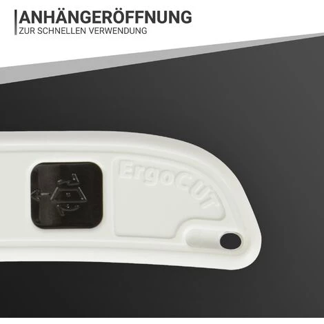 Bei Bedarf kann das Teppichmesser durch die kleine Öffnung am Ende der Unterseite als Anhänger an einem Band genutzt werden, um eine schnelle Bedienung auf der Arbeit oder Zuhause zu ermöglichen