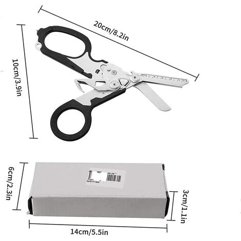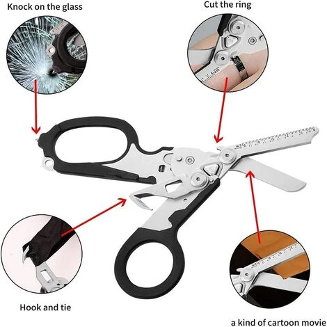 Lieferumfang: 1 x medizinische Multifunktionsschere in schwarzer Farbe, aus rostfreiem Stahl, mit 6 Werkzeugen, darunter ein Paar Riemenhaken, ein Ringschneider und mehr
