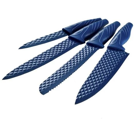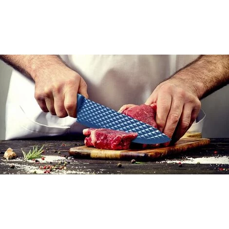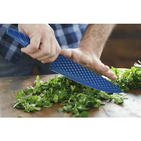 Mit innovativer Rhombenstruktur Ultraleicht stabil und scharf Für jede Aufgabe das richtige Messer Hervorragende Antihaft-Eigenschaften Mit dem Ceraflon Diamant Messer-Set haben Sie für jede Aufgabe das passende Messer parat. Sie erhalten ein Fleischmesser ein Chefmesser ein Brotmesser und ein Universalmesser. Die Spezialklingen mit Rhombenstruktur punkten mit ihrer hervorragenden Antihaft-Eigenschaft dabei sind sie ultraleicht stabil und extrem scharf. Nichts bleibt kleben oder haftet an. Durch den ergonomisch geformtem Griff liegen die Messer sicher in der Hand. Farbe: blau Material: Klinge: Edelstahl (3CR14) Griff: Kunststoff (PP) Pflegehinweis: per Hand spülen Lieferumfang: 1 x Fleischmesser 33cm Klinge 19cm 85g 1 x Chefmesser 34cm Klinge 20cm 110g 1 x Brotmesser 325cm Klinge 20cm 90g 1 x Universalmesser 24cm Klinge: 125cm 40g