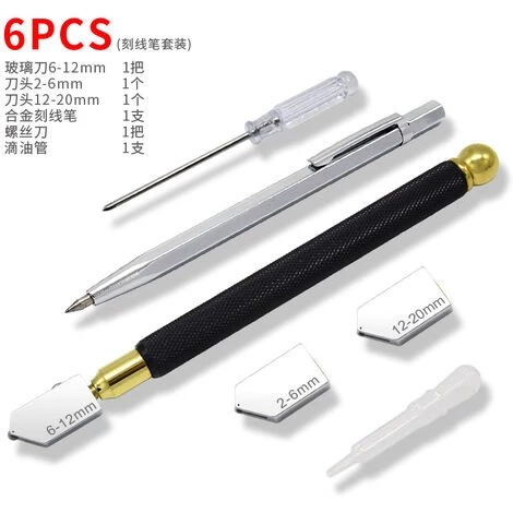 Produktparameter Material: Hartmetall-Schneidrad, Aluminiumgriff * 1,5 cm Grifflänge: 17,5 cm Gesamtgewicht: 205 g Farbe: schwarz Anwendungsbereich: Schneiden von Glasplatten, Spiegeln, Bodenfliesen, Keramikfliesen usw Produktliste: 1 * Glasschneider, 1 * Gravierstift, 1 * Schraubendreher, 1 * Konto-Tropfen, 2 * Ersatz-Schneidkopf