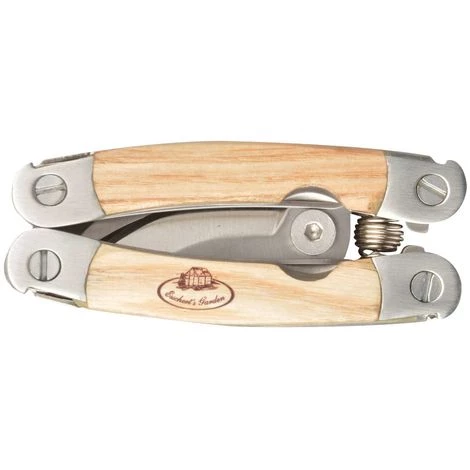 Es verfügt über 5 Werkzeuge, einen Haken zum Entfernen von Wurzeln (mit einem Messer an der kurzen Seite), eine Hippe, eine Schere mit Sicherheitsverschluss, einen Wurzeljäter und eine Holzsäge.