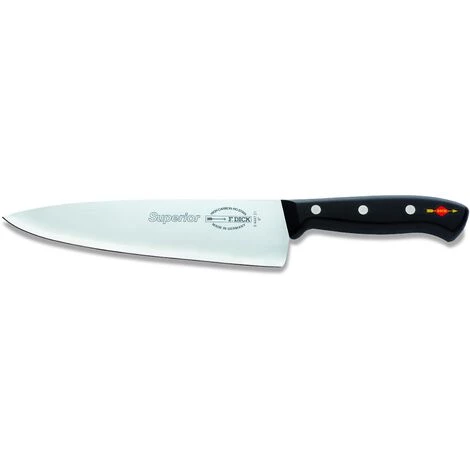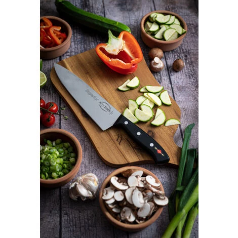 Klassiker und Herzstück der professionellen Küche. Das Kochmesser aus der Serie Superior ist der wichtigste Küchenhelfer für den vielseitigen Einsatz. Mit seiner 21 cm langen Klinge eignet es sich perfekt zum Schneiden von Kräutern und Gemüse, aber auch zum Zerteilen und Zerlegen von Fleisch und Fisch. Die geschwungene Schneide erleichert den Wiegeschnitt. Die Superior Serie ist für den Einsatz im professionellen Bereich konzipiert. Klassisches Design mit Griffnieten und die leichte Ausführung ergeben ein Messer in morderner Form und Funktion. Klinge und Griff sind ohne Spalt fest miteinander verbunden, dank dem durchgehenden Stahl bis zum Griffende wird eine hohe Stabilität erreicht. Das Nachschärfen der gesamten Schneide ist möglich. Klinge ist aus X55CrMo14 Stahl. Die ausgewogene Härte von 56° HRC ist der ideale Kompromiss für perfekte Schnitthaltigkeit und leichtes Nachschärfen. Made in Germany.