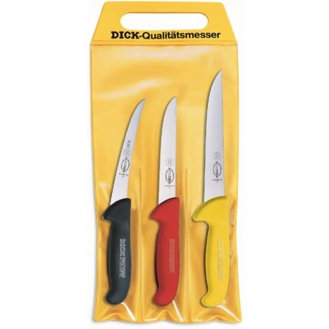 Im Set enthalten sind ein flexibles Ausbeinmesser mit schwarzem Griff und geschweifter Klinge (Klingenlänge 13 cm), ein breites Ausbeinmesser mit rotem Griff, (Klingenlänge 15 cm) und ein Stechmeser mit gelbem Griff (Klingenlänge 18 cm).