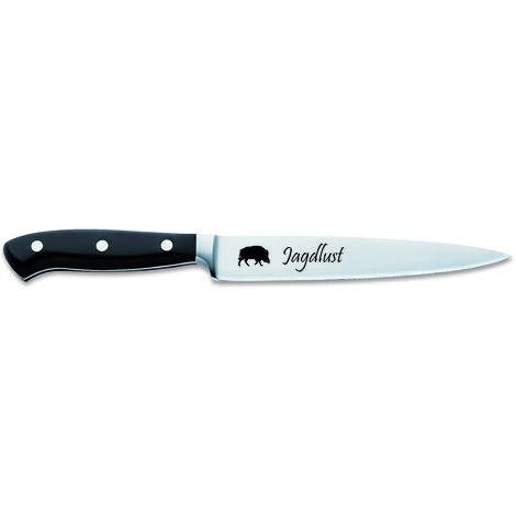 Das edle schwarz-rote F. DICK Logo auf der Klinge und die Jagd-Motive auf der Rückseite sind ein zusätzlicher Eyecatcher und machen die Messer zu etwas Besonderem.