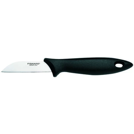 Klassisch, schlicht und für den täglichen Gebrauch unentbehrlich – handliche Messer wie das 31 g leichte Schälmesser aus der Essential Serie von Fiskars gehören in jede Küche. Das kompakte, verlässliche Messer mit einer 7 cm kurzen, geraden Klinge aus rostfreiem Stahl der Härte HRC 53 verfügt über eine stabile Spitze und scharfe Schneide. Das Schälen von Obst und Gemüse ist damit ebenso schnell erledigt wie das Entfernen von Makeln. Sicheren Halt bietet dabei der rutschfeste und ergonomisch geformte Griff aus schwarzem Kunststoff. Der ausgeprägte Fingerschutz verleiht dem Messer nicht nur eine elegante Linie – er schützt auch zuverlässig vor Verletzungen beim Schneiden. Mit klarem Wasser oder in der Spülmaschine gereinigt ist dieses sehr pflegeleichte Messer schnell wieder einsatzbereit. Aufbewahrt werden kann es liegend, aufrecht im Messerblock und – dank Aussparung am Griff – auch hängend an einem Haken.