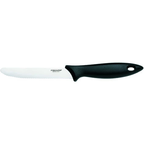 In schönster Fiskars-Tradition vereint dieses Tomatenmesser aus der Essential Serie innovatives Design mit einem hohen Maß an Funktionalität. Das mittelgroße Messer in ausgewogener, moderner Linienführung verfügt über eine 12 cm lange, gezahnte Klinge aus rostfreiem Stahl. Mit einer Härte von 53 HRC eignet sich dieses Messer besonders gut zum Schneiden von Lebensmitteln mit Kruste oder Schale wie beispielsweise Tomaten oder Brot. Klassisch geformt, schmal und an der Spitze abgerundet ist das 37 g schwere Tomatenmesser auch hervorragend als Tischmesser geeignet. Sein ergonomisch gestalteter Griff aus pflegeleichtem Kunststoff liegt dabei gut in der Hand, der ausgeprägte Fingerschutz verhindert versehentlichen Berührungen der Klinge beim Schneiden und beugt somit Verletzungen vor.