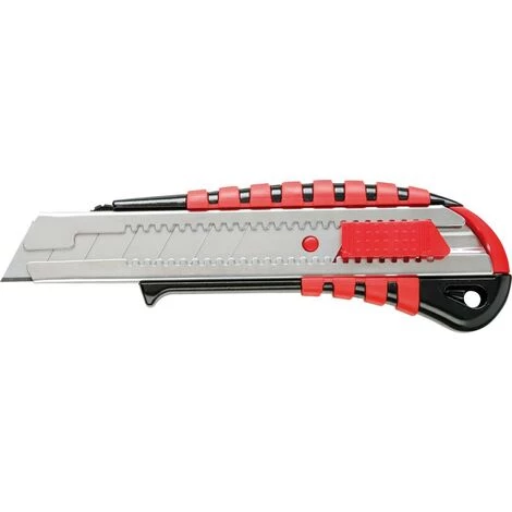 Ausf�hrung: Geh�use aus Zink-Druckguss mit Gummieinlage, Metall-Klingenf�hrung und Klingendepot. Fixierung der Klinge durch Drucktaste. Lieferung mit 1 Abbrechklinge.