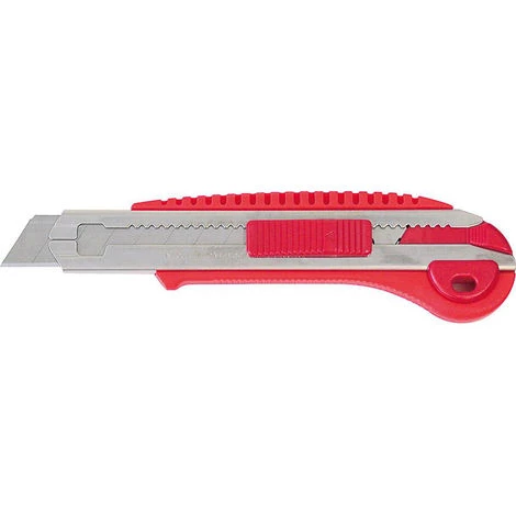 Ausführung: Gehäuse aus Kunststoff mit Metall-Klingenführung und Klingendepot. Fixierung der Klinge durch Drucktaste und zusätzlichem Feststellrad. Lieferung mit 2 Abbrechklingen.