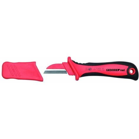 Artikelbeschreibung VDE-isoliert nach DIN EN 60900 Mit stabiler, gerader Klinge Gerade Schneide Mit Schutzkappe 2-Komponenten-Griff, handschonende Kraftübertragung