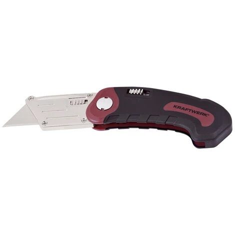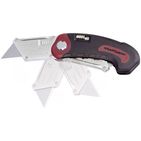 Kraftwerk 3304 Trapez Klappmesser 19 mm. Mit ergonomischem und rutschhemmendem Zweikomponentengriff. Mit Sicherheits-Schnellauswechsel-Mechanismus der Trapezklinge sowie Schnellver- und entriegelung des Klingenhalters. Lieferung inklusive 10 Trapezklingen im Dispenser.