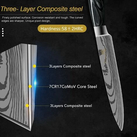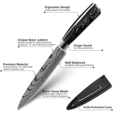 Besonderes Klingendesign: Die Kochmesser sind mit Schutzbügeln ausgestattet. Die Klinge sollte mit dem wellenförmigen Lasergravurmuster gestaltet sein, das die Schönheit und Genauigkeit verbessern kann. Das Kochmesser ist sorgfältig geschmiedet, geschliffen und poliert, unter Verwendung einer V-förmigen Feinbearbeitungsklinge, die die Schneide des Kochmessers mit unglaublicher Stärke und Qualität lange halten kann.