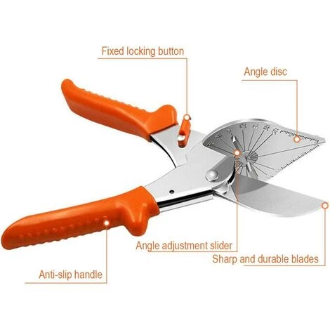Hohe Qualität – Die Winkelschere besteht aus SK5-Stahl. Robuster Stahlrahmen mit Kunststoffgriff für bequemes, langlebiges und hartes Diagonalschneiden Multi-Winkel einstellbar – Eingebauter durchsichtiger Schutz mit 45-, 60-, 75-, 90-, 105-, 120- und 135-Grad-Winkeln, die Sie schnell und einfach einstellen können der exakte Winkel, den Sie benötigen, genau und effizient.Perfekte Leistung – Starker Stahlrahmen mit Kunststoffgriff. Ergonomischer Griff, rutschfeste Softgrip-Griffe, verhindern das Abrutschen beim Arbeiten.Multifunktional – Winkel- und Längenskala am Rahmen helfen Ihnen, den Winkel in kürzester Zeit auszuwählen und zu messen, während Sie gleichzeitig die Präzision erhöhen und einen perfekten Gehrungsschnitt haben.< br>Breite Anwendungen – Dieser Winkelscherenschneider eignet sich zum Schneiden von Kunststoffstreifen, Holzstreifen, Wasserrohren aus Kunststoff oder anderen Kunststoffprodukten. Er ist das beste Werkzeug für Installateure, Elektriker, Zimmerleute.