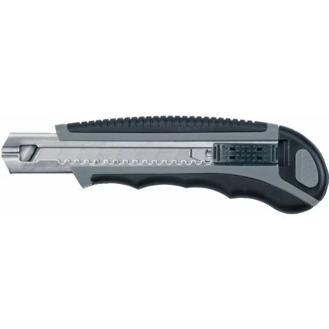 mit 6 Stück 18 mm Abbrechklingen, 5 Ersatz-Abbrechklingen im verriegelten Klingenmagazin, Entriegelung durch einfaches Drücken des Verriegelungsknopfes, Klingenführung aus robusten Edelstahl, Autoloadfunktion, einfaches Entnehmen der verbrauchten Klinge und automatisches Nachladen aus dem Klingenmagazin, Autolock-Funktion: automatische Verriegelung für sicheres Arbeiten, 2-Komponenten-Kunststoffgehäuse mit rutschfester Grifffläche.