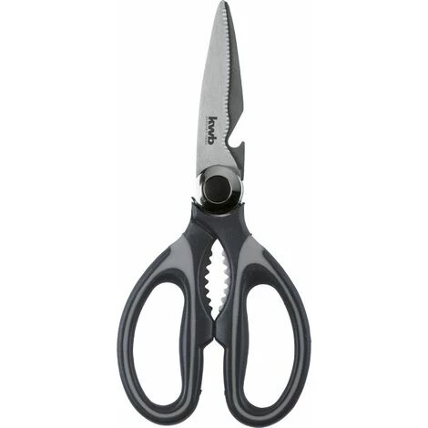 handlich, robuste 200 mm lange Haushaltsschere, Edelstahl-Scherenklinge mit gewelltem Sägeschliff von 80 mm, integriertem Kapselheber, Flaschen- oder Kronkorkenöffner, Nussknacker, zwei gleiche ergonomisch geformte Griffe, zum Schneiden von Papier, Pappe, dünnem Kunststoff, für Rechts- und Linkshänder geeignet.