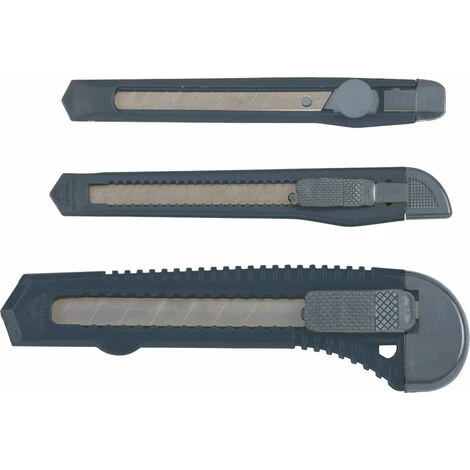 bestehend aus 2 Messern mit 9 mm Abbrechklinge und 1 Messer mit 18 mm Abbrechklinge, einfaches Entnehmen der verbrauchten Klinge hinten über die Verschlusskappe, je ein 9 und 18 mm Messer mit einem Klingenschieber mit Feststellfunktion und ein 9 mm Messer mit Drehgriff-Feststellfunktion für sicheres Arbeiten, Kunststoffgehäuse, Klingenabbrecher an der Verschlusskappe.