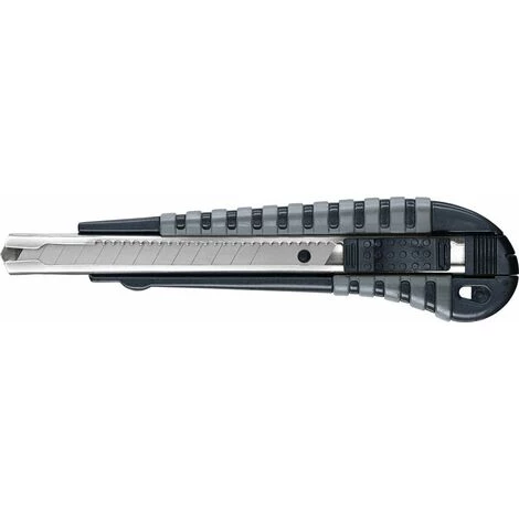 mit 1 Stück Abbrechklinge 18 mm, Klingenführung aus robustem Edelstahl, einfaches Entnehmen der verbrauchten Klinge hinten über die Verschlusskappe, Klingenabbrecher an der Verschlusskappe, mit Autolock-Funktion: automatisches Verriegeln für sicheres Arbeiten, optimales Einsatzgewicht, schweres Zink-Druckgussgehäuse mit gummierter, rutschfester Grifffläche.