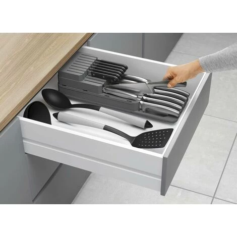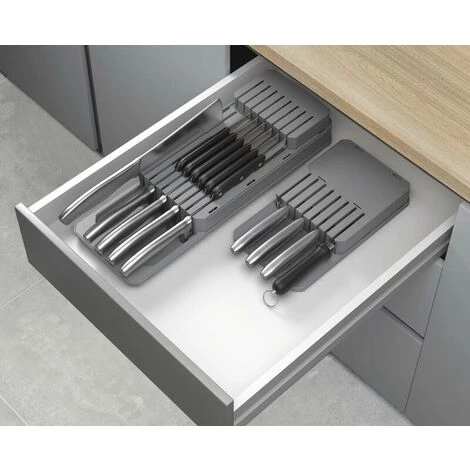 Verstellbarer Messer-Organizer zur platzsparenden und sicheren Aufbewahrung verschiedener Messertypen.
