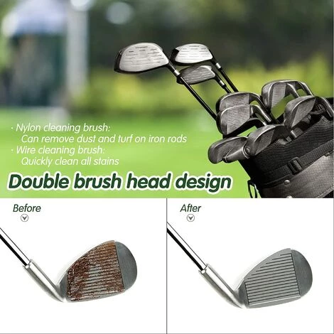 Doppelseitiges Golfbürstendesign: Unsere Golfreinigungsbürste hat eine doppelköpfige Bürste, und die Stahldrahtborsten können die Eisen auf dem Fairway schnell und effektiv reinigen. Nylonborsten erleichtern die Reinigung von Holz und Schuhen. Sorgen Sie für die gründlichste Reinigung Ihrer Golfschläger in wenigen Minuten.