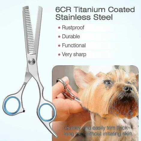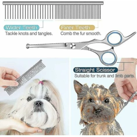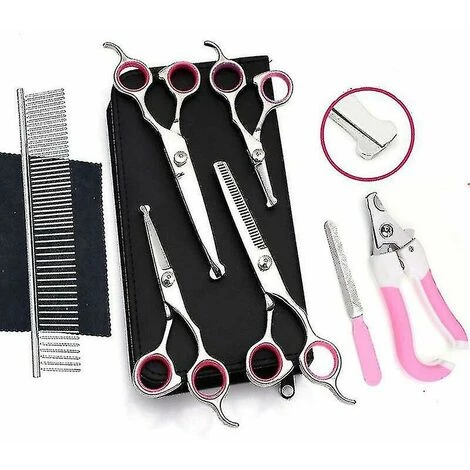 - 7 Hundepflegescheren: Geliefert mit 1 geraden Schere, 1 geraden Schere, 1 Effilierschere, 1 gebogenen Schere, 1 Edelstahlkamm und einer Aufbewahrungsbox. Perfekt zum Trimmen von Ohren, Gliedmaßen, Beinen und Kragenhaaren. Design mit runder Sicherheitsspitze: Mit einer speziell abgerundeten Spitze sorgt dieses Scherenset für ein minimales Risiko bei der Pflege der empfindlichen Bereiche Ihrer Haustiere wie Augen, eine sicherere Verwendung und keine Sorgen mehr über versehentliche Verletzungen. Hochwertiges Material: Die Schere aus titanbeschichtetem 6CR-Edelstahl ist rostfrei, langlebig, funktional und sehr scharf in der Anwendung. Sie schneidet schnell und einfach durch langes, dickes Haar, ohne die Haut von Haustieren zu reizen. Bequemer Griff: Ergonomisch gestaltete Schere, einfach zu bedienen und zu kontrollieren, kann Ihre Hand im bequemsten Winkel halten, ohne Ihre Finger nach längerem Gebrauch zu verletzen. Die Ringe sind abnehmbar für eine breitere Verwendung mit den Fingern und verbessern den bequemen Griff. Einstellschraube: An beiden Klingen befindet sich eine Einstellschraube zur Spannungskontrolle, sodass Sie die Abdeckung im Uhrzeigersinn festziehen oder gegen den Uhrzeigersinn lösen können. Großartig für Anfänger, beginnen Sie zu Hause mit dem Erstellen von Frisuren für Ihre lieben Haustiere.