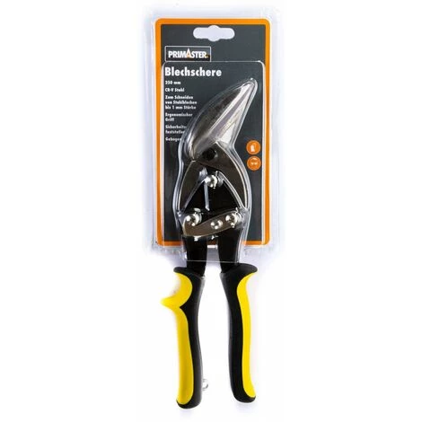 Die Primaster Blechschere gebogen, eignet sich besonders gut für gerade Schnitte durch Blech. Das Verletzungsrisiko ist mit dieser Schere deutlich verringert, da die Griffe der Schere über dem Blech zu bedienen sind. Schnitte mit der Primaster Blechschere gebogen fallen so einfacher zu schneiden.Besonders gut geeignet für gerade Schnitte ohne Verletzungsrisiko Material: Chrom-Vanadium Stahl zum Schneiden von Stahlblechen bis 1 mm Stärke Maße der Schneide: 250 mm Kunststoffgriff Ausführung: gerade-schneidend über dem Blech