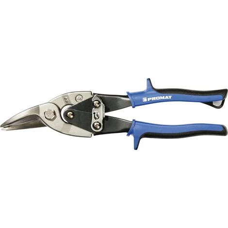Figurenschere L.248mm re.STA max.1,2mm PROMAT Qualitätsstahl 62HRC · Schneiden kpl. gehärtet · geeignet für kurze gerade und Figurenschnitte · hebelübersetzt · ergonomisch geformte 2-K-Griffe mit PVC-Überzug und Abgleitschutz Weitere technische Eigenschaften: · Griff: 2-Komponentenhüllen · HRC: 62 · Schneide: Qualitätsstahl