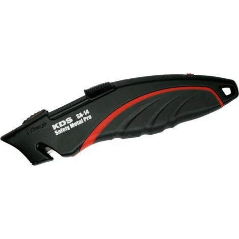 hoher Schutz vor Verletzungen, selbst einziehende Klinge, Klinge wird auch bei gedrücktem Knopf automatisch in das Gehäuse zurückgeführt wenn sie denn Kontakt zum Schneidmaterial