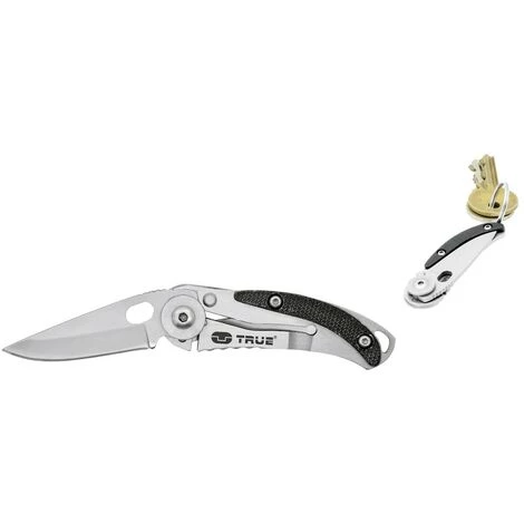 Das Einhandmesser SKELETONKNIFE von TRUE ist mit einer Klinge aus rostfreiem 420er Edelstahl ausgestattet. Mit Hilfe eines Klingendurchbruchs lässt sich die Klinge mit nur einer Handbewegung leicht in Arbeitsstellung bringen und ein Framelock Mechanismus arretiert die Klinge zuverlässig. Der schwarz-silberne, ergonomische Griff liegt sicher in der Hand. Durch den offenen Rahmen besitzt das Messer ein minimalistisches Design. Eine Fangriemenöse und ein Gürtelclip vervollständigen die Ausstattung.