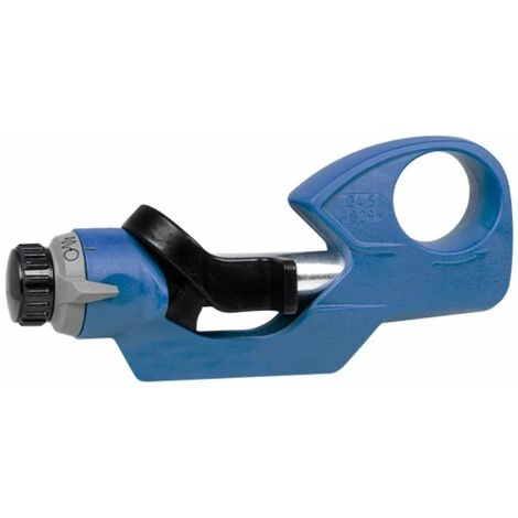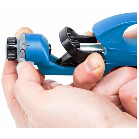 Die Klingentiefe ist komfortabel und präzise einstellbar. Man kann sie mit einem arretierbarem Drehknopf in Schritten von 0,1 Millimeter von 0 bis 3 Millimeter festlegen. Unterliegende Schichten werden dadurch nicht beschädigt. Das handliche und ergonomische Werkzeug verfügt über ein Blockier-System. Diese Funktion verhindert das Öffnen in der Längsschnitt-Einstellung.