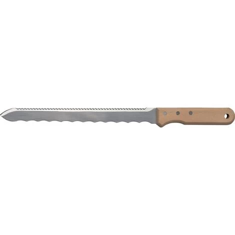 Dämmstoffmesser Klingen-L.280mm Holzgriff 40711 beidseitig geschliffene Klinge · Sägeschliff für dichtes und hartes Material wie z. B. Styropor · Wellenschliff für weiches und leichtes Material wie z. B. Mineralwolle · symmetrische Klingenspitze zum Bohren von Löchern, z. B. Drahtseile oder Leitungen · rostfrei · mit Holzgriff ·