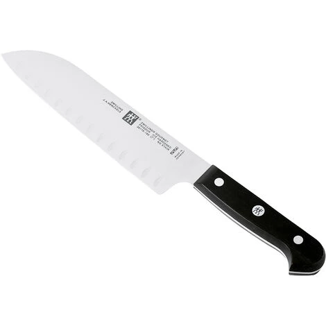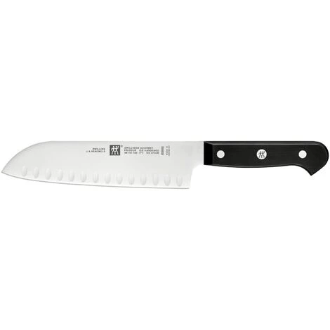 ZWILLING Santokumesser mit Kullen 18 cm Rostfreier Spezialstahl, Griffmaterial: Kunststoff, ZWILLING Sonderschmelze – aus einem Stück, FRIODUR® Klinge, eisgehärtet, 3-Nieten-Design mit eingelasertem ZWILLING auf der mittleren Niete, Made inGermany
